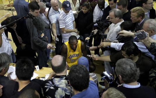 Bryant é cercado pelos jornalistas durante o Lakers media day
