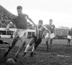 Scala domina a bola em um Gre-Nal da década de 60, observado por Alcindo, o Bugre