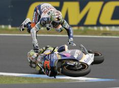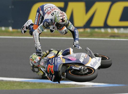Os treinos também tiveram acidentes do campeão mundial australiano Casey Storner e do piloto da San Marino Alex de Angelis, que voou sobre sua moto após uma queda no circuito de Phillip Island, como mostra a foto.
