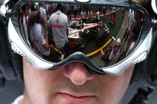 Carro de Alonso refletido em óculos de mecânico da McLaren em Interlagos
