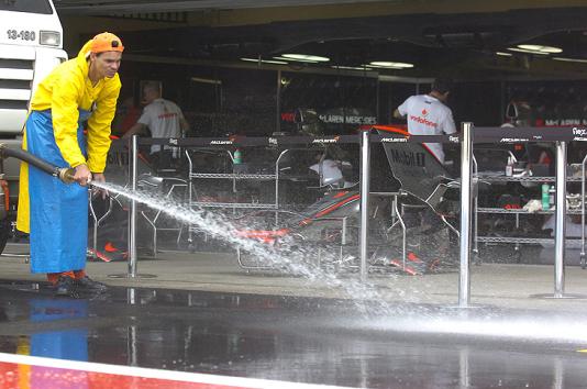 Funcionários do circuito de Interlagos acertam os últimos detalhes para a corrida de domingo