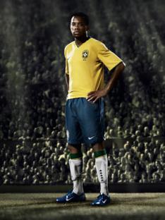 Robinho fardado com o novo modelo que será usado nas Eliminatórias da Copa de 2010 e nos Jogos Olímpicos de Pequim