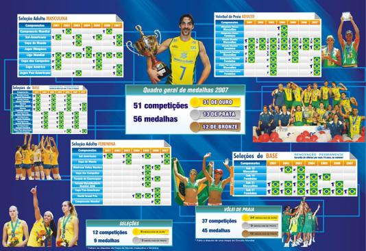 lidera o ranking mundial feminino de vôlei indoor. No vôlei de praia, em 37 competições foram conquistadas 45 medalhas por atletas brasileiros.