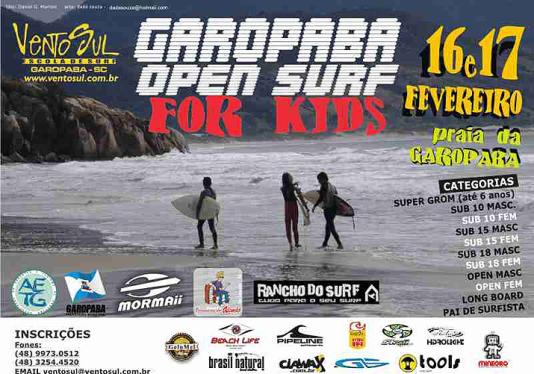 No próximo fim de semana, dias 16 e 17 de fevereiro, acontece o II Garopaba Open de Surf, evento que vem movimentando a cena do surf na cidade. Depois do sucesso do primeiro evento, a organização decidiu realizar uma edição For Kids. O evento tem o objetivo de promover a confraternização entre surfistas e as crianças do município, que estarão participando de atividades paralelas e da captação de imagens para um DVD.