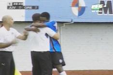marcação, acaba cedendo escanteio. Na cobrança, a defesa do Juventude erra e a bola sobra para Perea, na pequena área. O atacante bate no travessão e perde uma
