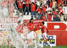 26 minutos — Alex cobra nova falta na ponta esquerda e Fernandão cabeceia. Os jogadores do Inter reclamam que a bola tocou na mão de um zagueiro, mas Simon manda o jogo em seguir