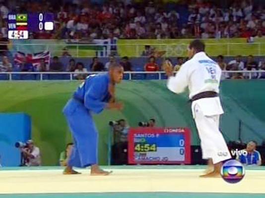O brasileiro Eduardo Santos está nas quartas-de-final da disputa de judô até 90kg dos Jogos Olímpicos de Pequim. Na madrugada desta quarta, ele derrotou o venezuelano José Camacho por ippon. É a segunda vitória do paulista. Antes, ele havia superado o chinês Yanzhu He, também pelo golpe máximo.
