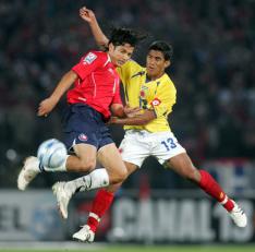 O confronto no Estádio Nacional começou pegado. O colombiano Fuentes tomou o cartão amarelo antes do primeiro minuto de jogo. No Chile, Sánchez também foi afobado para o lance e recebeu a mesma punição ainda antes dos três minutos. As faltas continuaram nos primeiros minutos, mas logo o futebol chileno começou a aparecer. Os anfitriões chegaram aos cinco minutos, com o chute de fora da área de Fernandez, que o goleiro Agustín encaixou. Aos nove, Suazo foi lançado, mas novamente o goleiro colombiano saiu bem para antecipar.